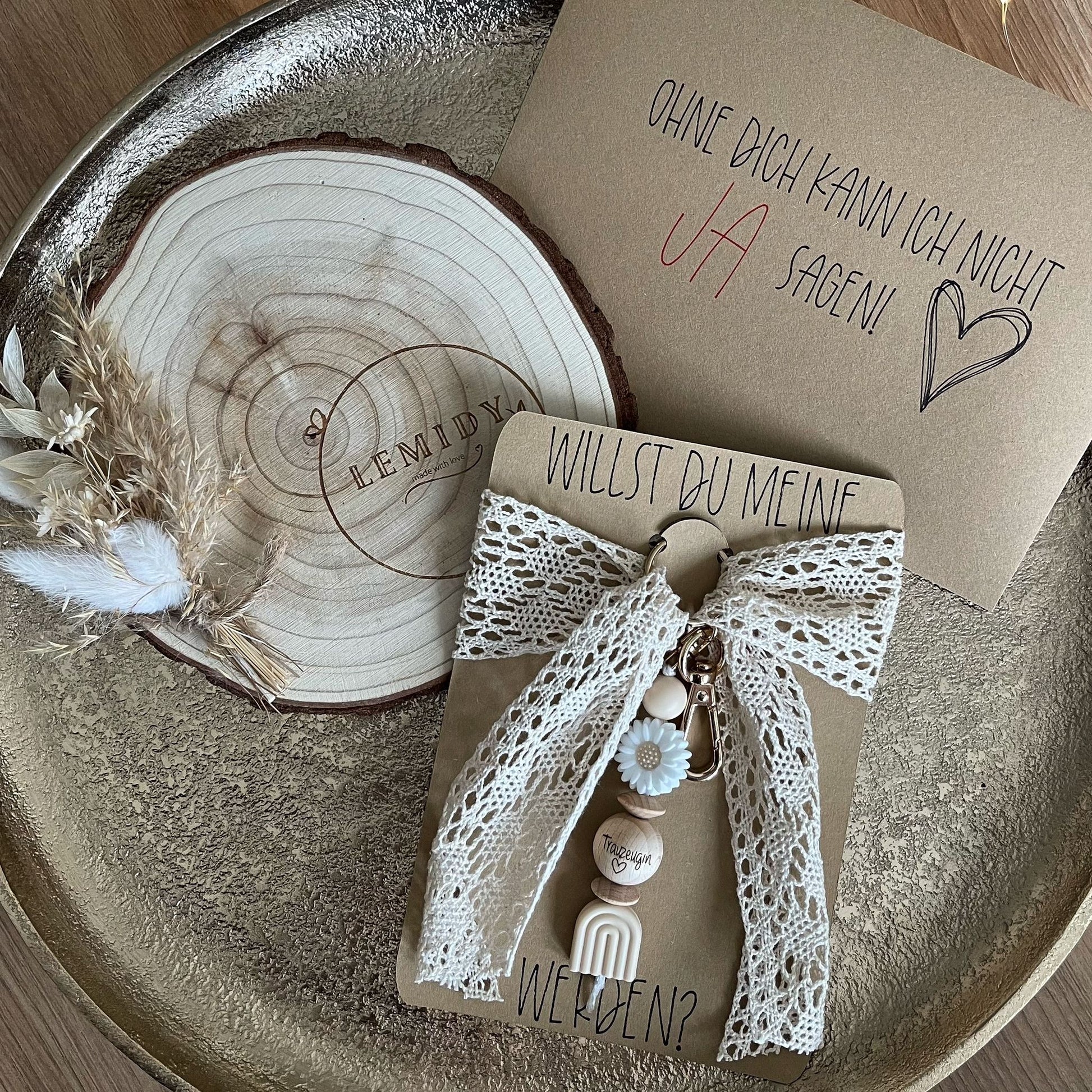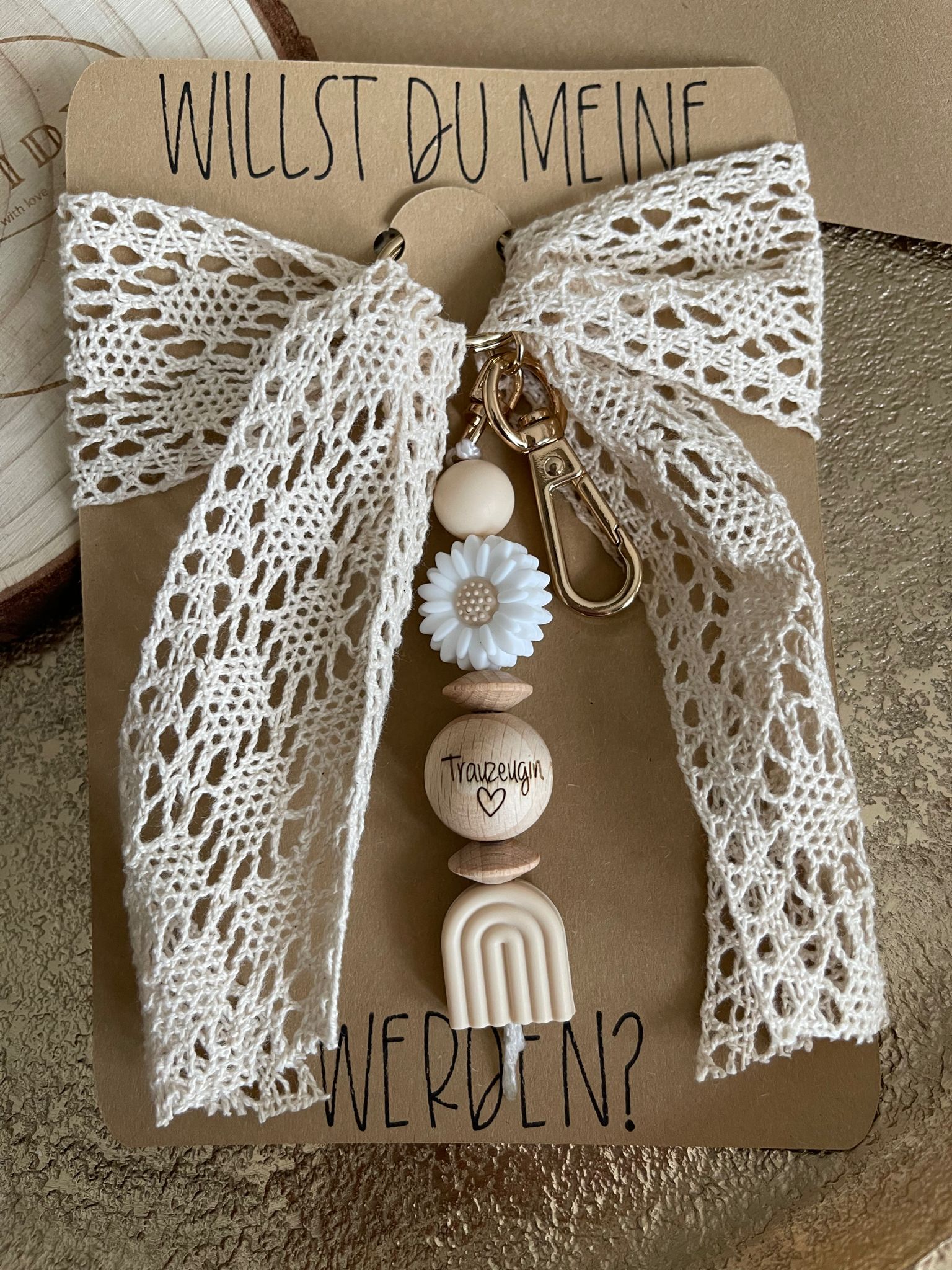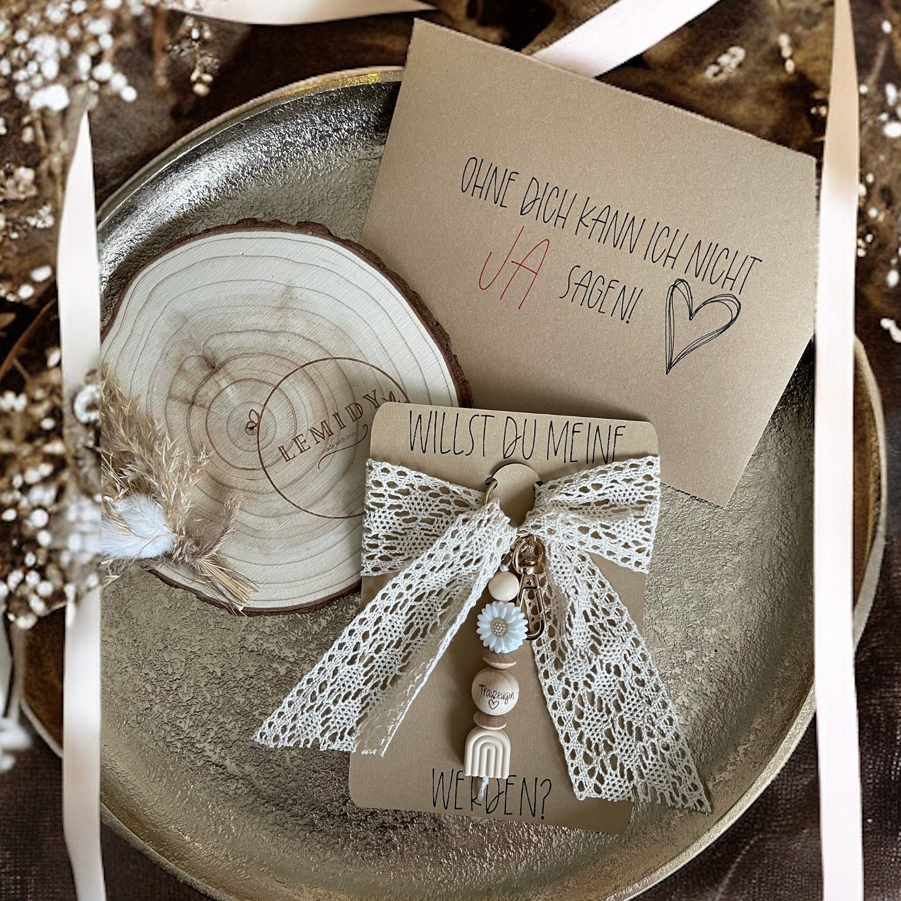 Das Set beinhaltet ein Briefumschlag mit dem Text "ohne dich kann ich nicht JA sagen", eine Karte mit der wichtigen Frage "möchtest du meine Trauzeugin/Trauzeuge werden?" und ein Schlüsselanhänger inkl. Wunschgravur als Erinnerungsstück.