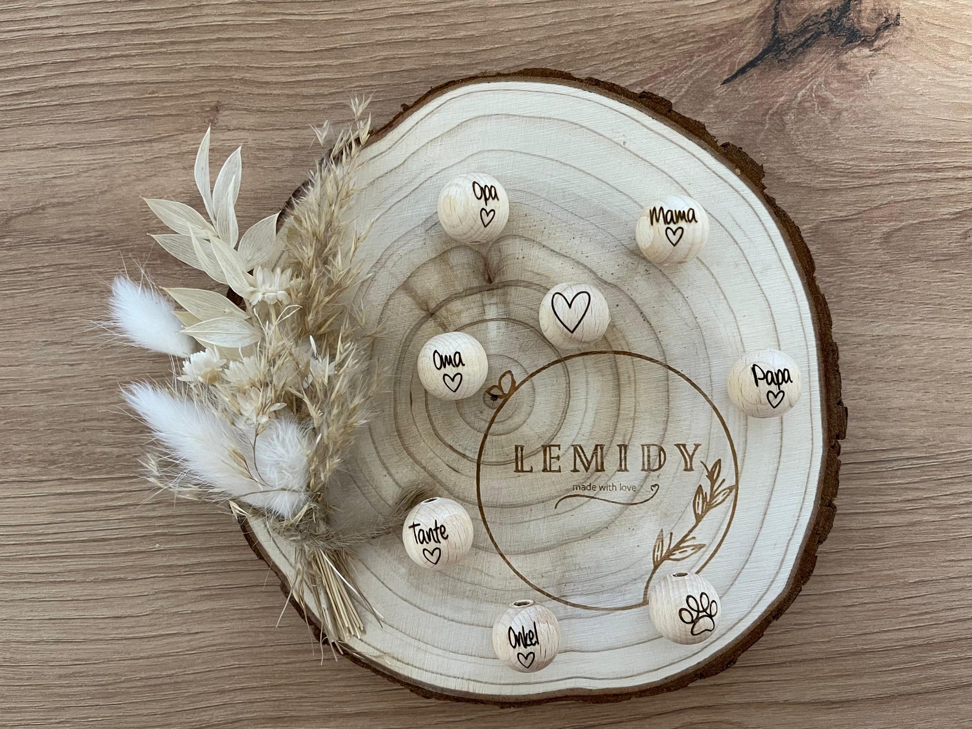 Zur Auswahl stehen die Farben wie angegeben in Beige, Lila, Weiß und Rosa und Gravur mit "Mama, Oma, Oma" oder Name deiner Wahl mit einem Herz. Falls kein Herz erwünscht ist, bitte einfach als Kommentar in der Bestellung mit angeben.