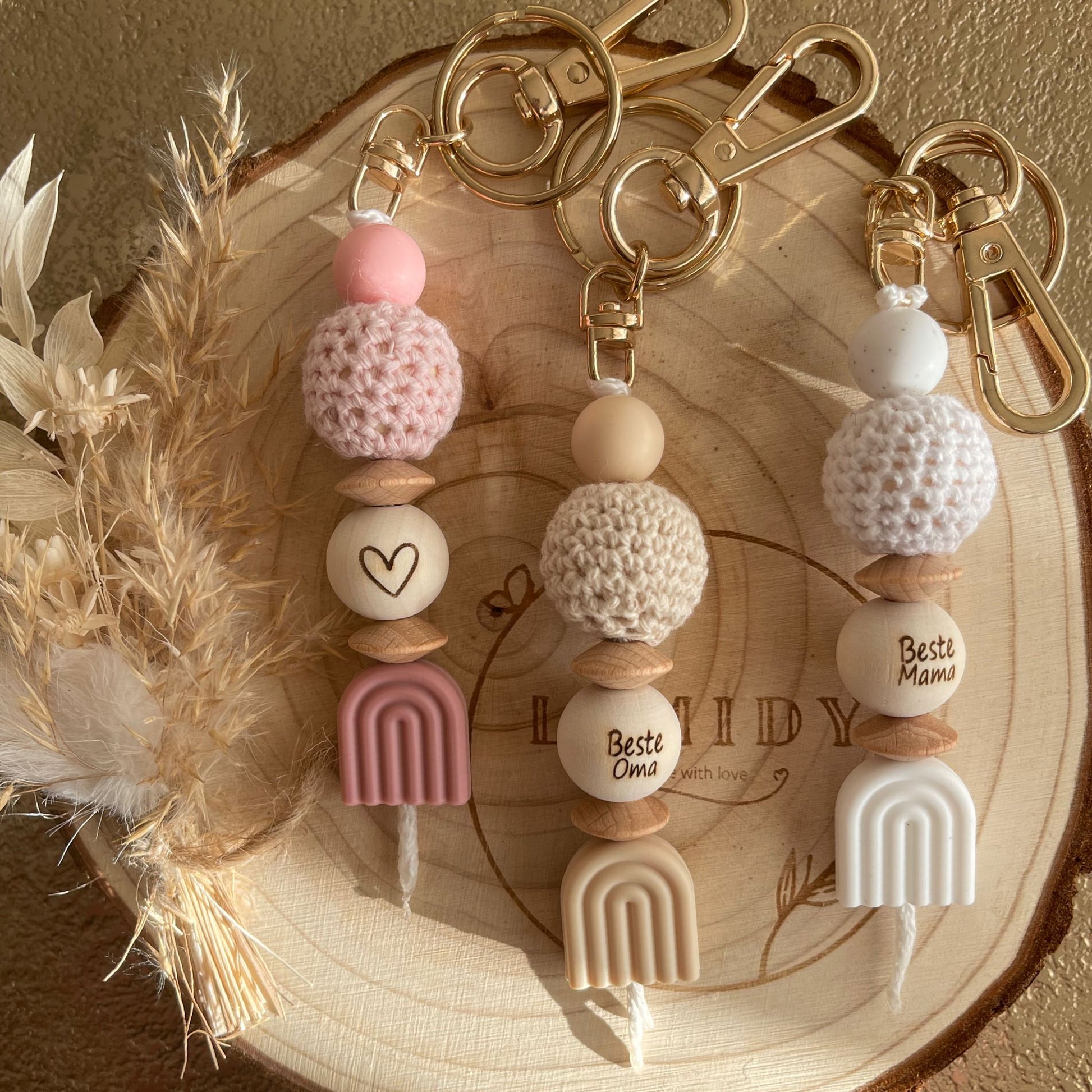 - Wir verwenden nur die besten Materialien für unsere handgefertigten Anhänger. Natürliche Perlen, Silikon und andere sorgfältig ausgewählte Komponenten garantieren Langlebigkeit und Qualität.