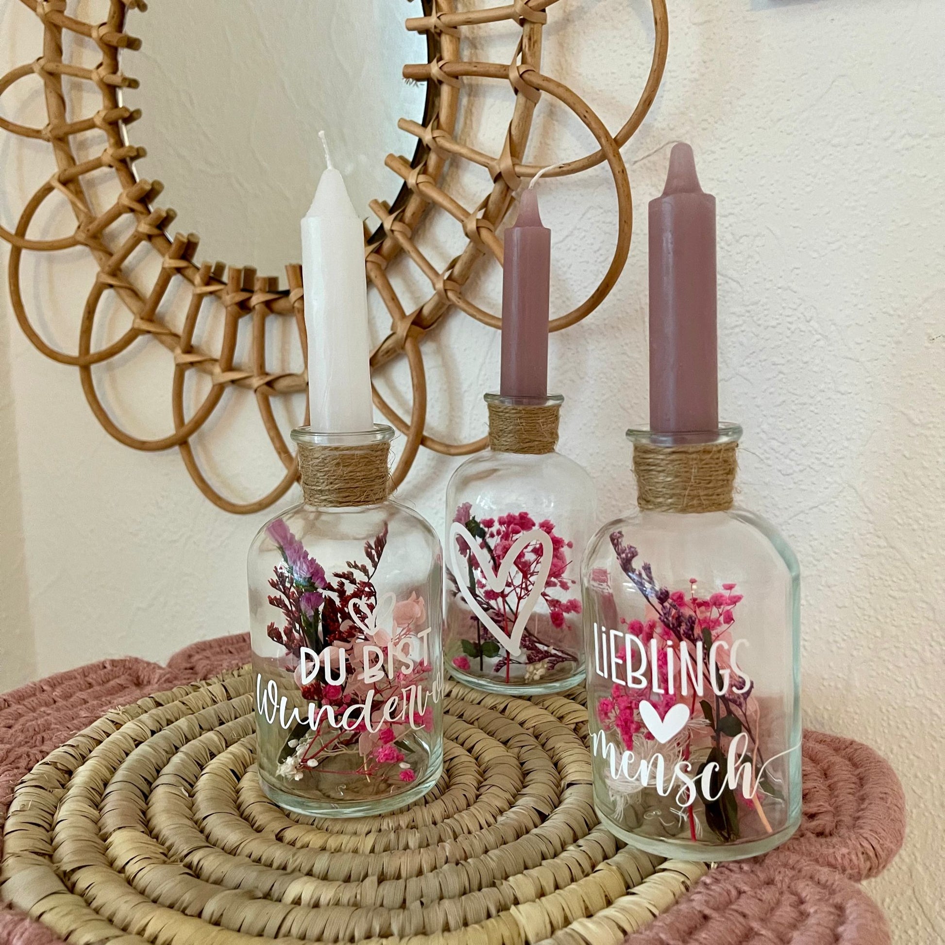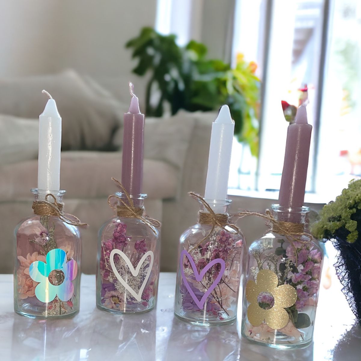 Jedes Kerzenglas wird mit echten Trockenblumen gefüllt und mit einem Motiv deiner Wahl versehen.