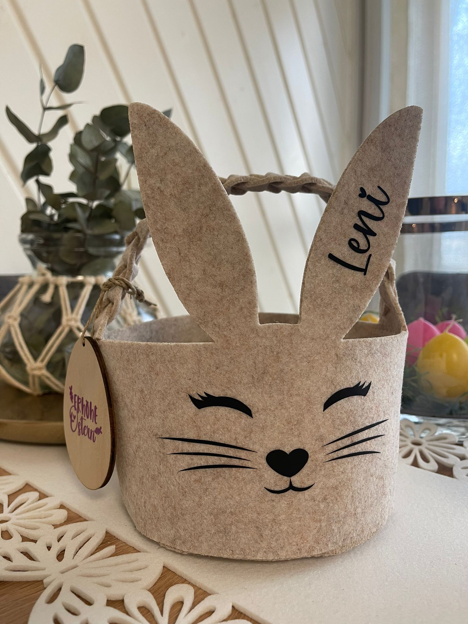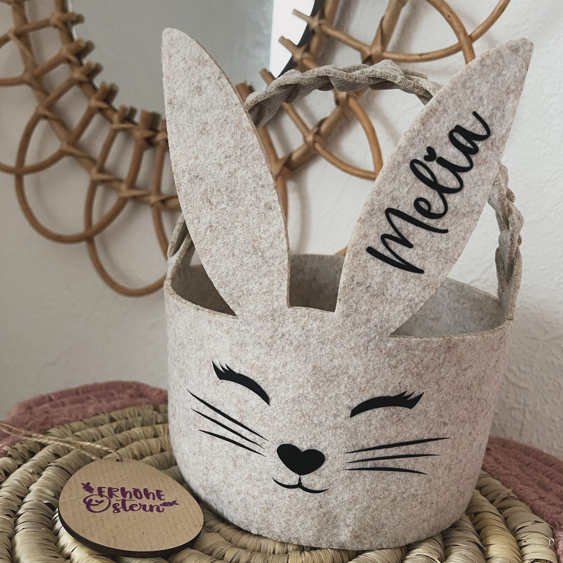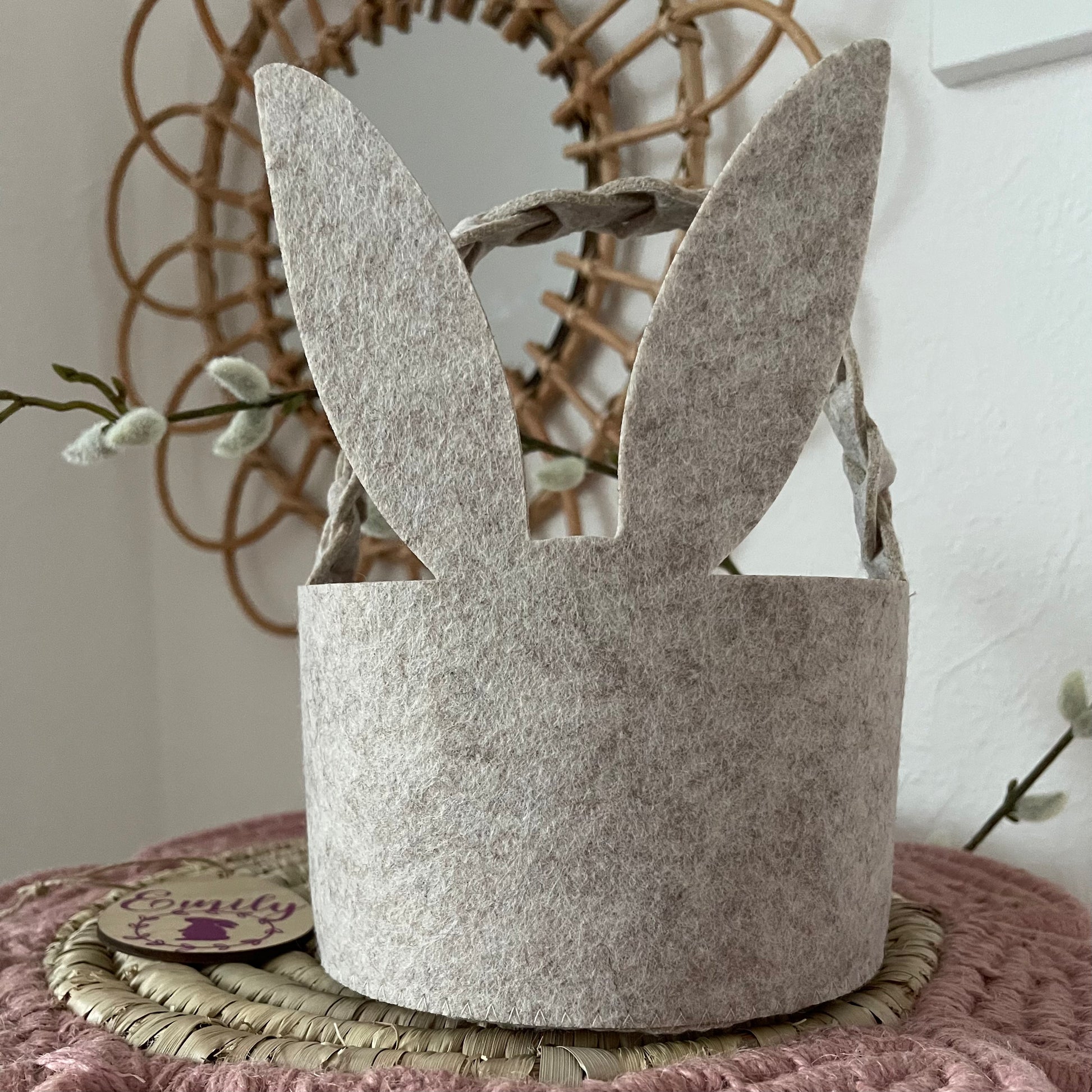 Entdecke unsere handgefertigten Osterkörbchen, die jedem Osternest eine besondere Note verleihen. Jedes Körbchen wurde mit Liebe zum Detail per Hand angefertigt und ist ein Unikat. Die Körbchen sind aus Filz angefertigt und daher besonders leicht und somit auch für die Kleinsten geeignet. Mit dem Namen deiner Liebsten personalisiert, sind diese Körbchen nicht nur praktisch für die Eiersuche, sondern auch eine schöne Dekoration für dein Zuhause. Perfekt für kleine Ostergeschenke oder süße Leckereien - unsere handgefertigten Osterkörbchen bringen Freude und Frühling in jeden Raum.